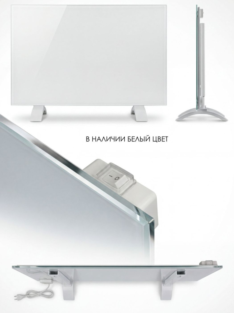 Обогреватель создан на стеклянной основе белого, черного цвета.