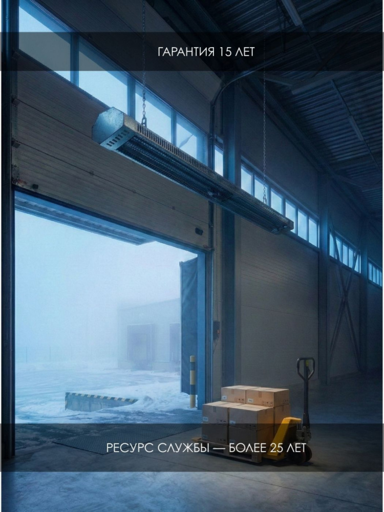 Принцип работы: 90% энергии преобразуется в поток тепловых лучей, которые нагревают непосредственно предметы и поверхности (пол, оборудование, людей). Это исключает нецелевой нагрев подпотолочного пространства в высоких помещениях.
