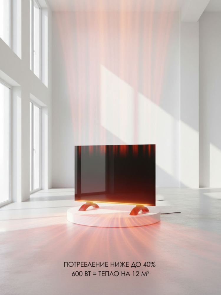 Обогреватель создан на стеклянной основе белого, черного цвета.