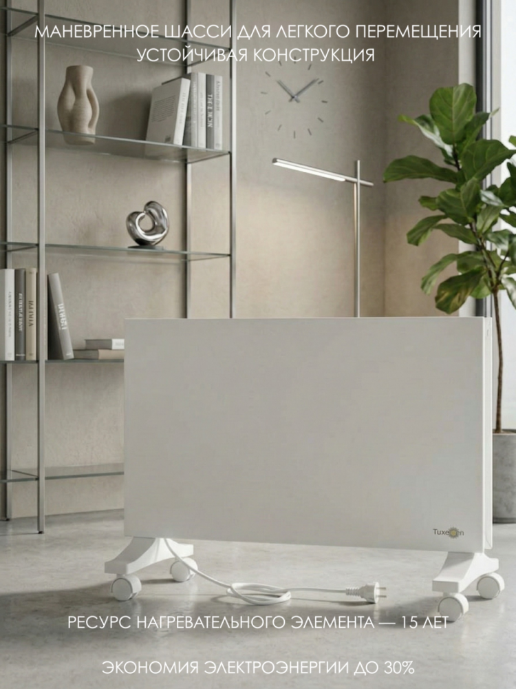 Инфракрасный электрообогреватель 700 Вт мощностью, мобильный. Оборудован ножками на колесах для удобства применения, может быть модифицирован в настенный прибор. Предназначен для обогрева жилых и административных помещений, при высоте потолка до 3,5 м. прогревает до 10м2 как основной вид отопления и до 16 как вспомогательный. Температура поверхности 90 градусов, размеры 70х40х5 см. белый, двухжильный провод с вилкой. Позволяет создать комфортный микроклимат в помещение с одинаковой температурой у пола и под потолком, абсолютно пожаробезопасен. Сертифицирован к использованию без надзора. Срок службы до 15 лет, гарантия производителя 5 лет.